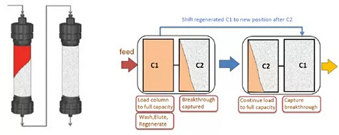 ? ? 傳統(tǒng)層析工藝,由于流穿效應(yīng),有30-50%的填料是無法被完全利用的,從而使得載量和處理量大為受限。Capture SMB用于優(yōu)化捕獲環(huán)節(jié),作為最簡單和最優(yōu)化的2柱位設(shè)計,可使純化效率顯著提高,并且使填料用量大為縮減。