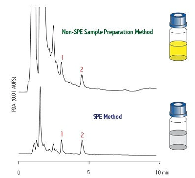 圖5給出了另一個(gè)示例。靠上的譜圖表明化合物#1和#2均受到樣品基質(zhì)引起的明顯干擾。靠下的譜圖表明使用SPE進(jìn)行適當(dāng)樣品制備后可顯著提高結(jié)果質(zhì)量(基線干凈)。請(qǐng)注意,一條明顯更干凈的基線可提高分析結(jié)果的準(zhǔn)確度。如果該樣品需要對(duì)化合物進(jìn)行分離和純化,那么也可以獲得一種純度明顯更高的萃取物。