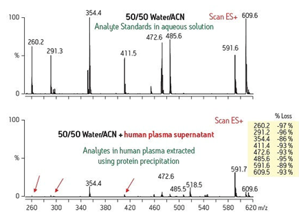 復(fù)雜樣品基質(zhì)帶來的第二種問題在我們觀察質(zhì)譜輸出圖譜(LC/MS或LC/MS/MS)時(shí)可以看到。為了獲得適當(dāng)?shù)馁|(zhì)譜響應(yīng)信號(hào)(靈敏度),必須使該化合物離子化。如果該化合物離子的形成因樣品基質(zhì)干擾物而受阻,那么相應(yīng)的信號(hào)強(qiáng)度也會(huì)大大減弱。