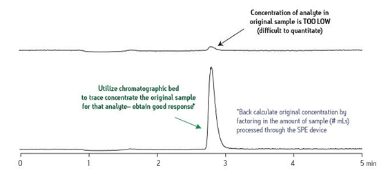 分析環(huán)境樣品中的痕量污染物或者代謝物在生物液體內(nèi)隨時(shí)間的變化情況就是一個(gè)可以說明這一點(diǎn)的較好例子。圖9中靠上的圖譜表明使用原始純樣品進(jìn)行分析時(shí),目標(biāo)化合物的信號(hào)響應(yīng)差。通過以SPE作為痕量濃縮策略制備樣品后再使用相同的分析條件進(jìn)行分析后所獲得的靠下的圖譜表明這種化合物的信號(hào)強(qiáng)度顯著提高。根據(jù)這一結(jié)果,我們可以準(zhǔn)確計(jì)算出純樣品中的原始化合物濃度。