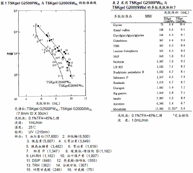 ??? 本報告中,將針對這些填充劑(TSKgel G2000SWXL以及TSKgel G2500PWXL)在多肽分離的應(yīng)用上進行探討。