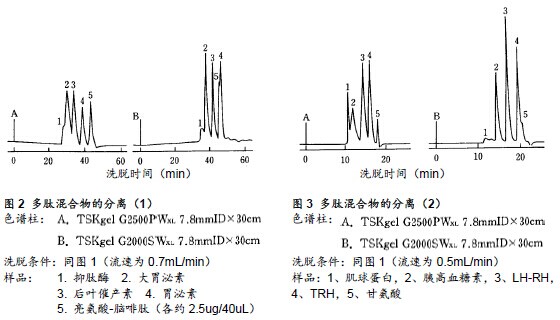 ??? 圖2、3所示為TSKgel G2500PWXL與TSKgel G2000SWXL在分離多肽標(biāo)準(zhǔn)品時的對比圖。通過色譜圖可以明確的看出,TSKgel G2000SWXL吸收峰形與分離帶的寬度均更佳,因此其分離性能更為優(yōu)異。另一方面,如果多肽的分子量小于1000,由于樣品與填充劑之間的某些相互作用,使用TSKgel G2500PWXL時的分離效果要高于TSKgel G2000SWXL。例如圖2中所示的后葉催產(chǎn)素(MW1007)與亮氨酸-腦啡肽(MW555)、以及圖3所示的TRH(MW362)與甘氨酸(MW75)均顯示了其分離效果高于TSKgel G2000SWXL。