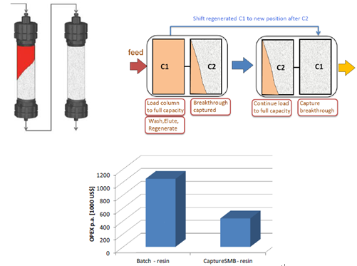 傳統(tǒng)層析工藝,由于流穿效應(yīng),有30-50%的填料是無(wú)法被完全利用的,從而使得載量和處理量大為受限。Capture SMB用于優(yōu)化捕獲環(huán)節(jié),作為最簡(jiǎn)單和最強(qiáng)大的2柱位設(shè)計(jì),可使純化效率顯著提高,并且使填料用量大為縮減。