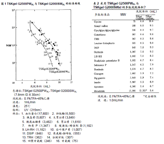 一般情況下,采用GFC法分離多肽所使用的填充劑多為TSKgel的SW硅膠型填料而非TSKgel的PW樹脂型填料。本文中將針對這些填充劑(TSKgel G2000SWXL以及TSKgel G2500PWXL)在多肽分離的應(yīng)用上進(jìn)行探討。