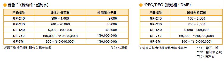 Asahipak GF系列色譜柱的校準(zhǔn)曲線