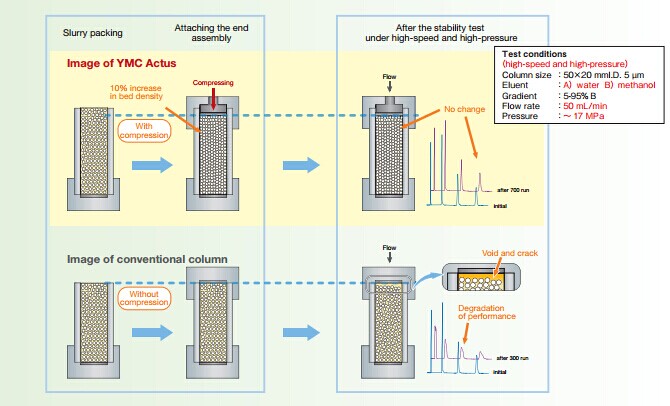YMC-Actus具有高理論塔板數(shù)、高分離能的優(yōu)點(diǎn)。即使在壓力變化很大的苛刻條件下也不會引起該性能的降低。