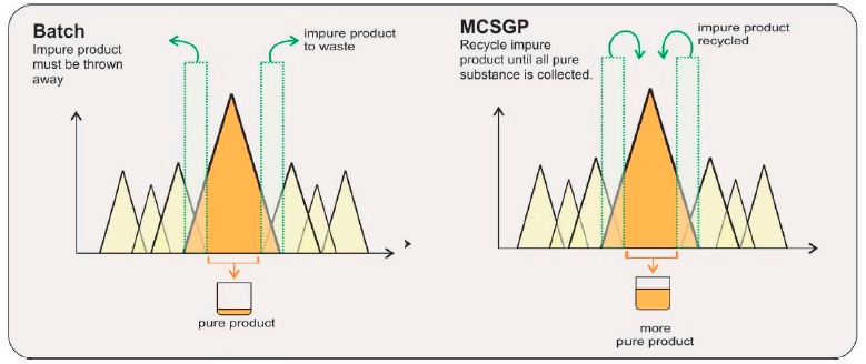 MCSGP工藝,可將含有不純組分的產(chǎn)品回收在一個封閉的環(huán)內(nèi),進行循環(huán)式的層析操作,從而最大限度地提取純產(chǎn)品,使得收率和純度二者兼得。