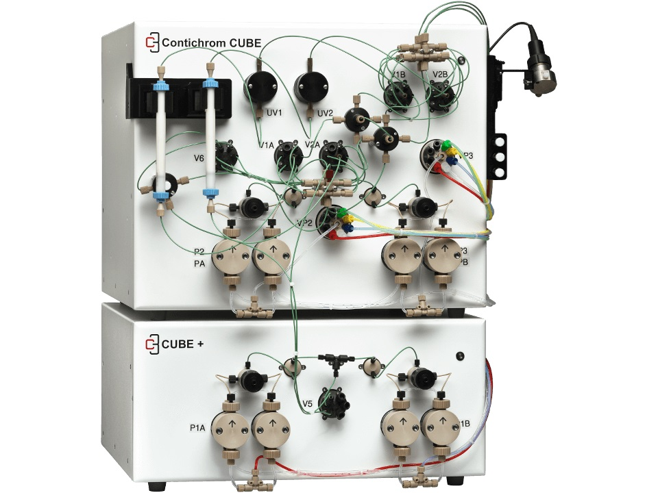 Contichrom層析系統(tǒng),已由2004年的6-8柱位設(shè)計、2006年的3柱位設(shè)計,發(fā)展為最優(yōu)化的2柱位設(shè)計,可運行多種層析模式,如標準批處理過程、MCSGP(多柱逆流溶劑梯度純化)、N-Rich等,實現(xiàn)了層析新技術(shù)與層析系統(tǒng)軟硬件設(shè)計的完美結(jié)合,使得設(shè)備成本更低,構(gòu)造更為簡化,并可使層析填料、緩沖液等成本投入大為節(jié)省,同時也使得純化周期大為縮短。