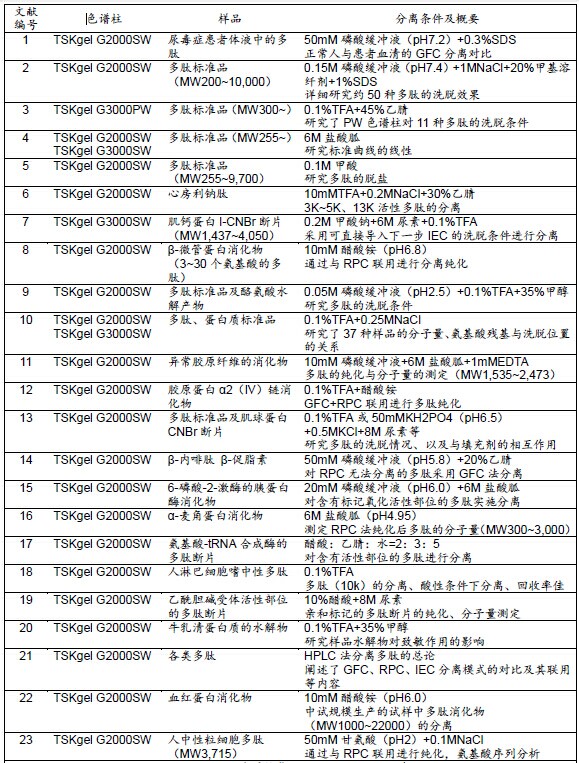 ??? 表1所示為TSKgel色譜柱在采用GFC法進行多肽分離的相關(guān)文獻及其概要。