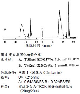 ????圖4所示為分離基因重組ProteinA的TRCK-胰蛋白酶消化物的實例。樣品中含有與蛋白質(zhì)消化物分子量不同的各類多肽。如上所示,由于TSKgel G2000SWXL色譜柱的分離范圍較寬,其分離效果也更好。(該樣品通過RPC分析的結(jié)果,可觀察到約有60種多肽峰在RPC下被檢測到)。