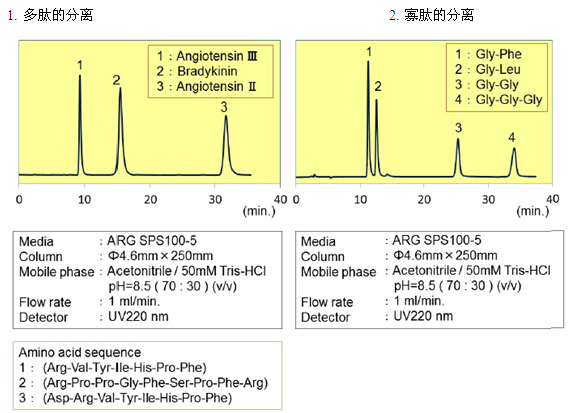 親水化合物一般是用反相模式來進行分離,例如使用C18填料。但是,仍然有很多親水的化合物不能用普通的反相模式來分離。近些年來,HILIC模式的填料應運而生,特別適合分離親水性化合物(極性大的化合物)。富士硅化學有限公司開發(fā)了HILIC模式的“ARG硅膠”。ARG硅膠可用于分離氨基酸、多肽、維生素和核酸。不同粒徑的ARG硅膠可分別應用于分析以及大規(guī)模的分離純化。