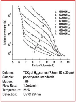 3. Hhr型色譜柱為常規(guī)的GPC色譜柱,尺寸為7.8mm ID×30cm。當使用此類常規(guī)色譜柱時,大多數(shù)的HPLC系統(tǒng)無需進行針對柱外峰展效應(yīng)的優(yōu)化。