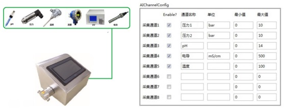 系統(tǒng)提供8路傳感器通道,可接受4~20mA及-10V~+10V的信號(hào)輸入,可連接絕大部分類型的傳感器,比如:壓力、溫度、流量、電導(dǎo)、pH、UV等。