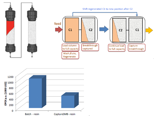 傳統(tǒng)層析工藝,由于流穿效應(yīng),有30-50%的填料是無法被完全利用的,從而使得載量和處理量大為受限。Capture SMB用于優(yōu)化捕獲環(huán)節(jié),作為最簡單和最強大的2柱位設(shè)計,可使純化效率顯著提高,并且使填料用量大為縮減。