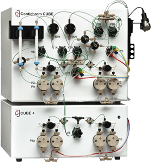 所有的Contichrom系統(tǒng)可以將兩個(gè)層析步驟(例如捕獲和精純)整合為一個(gè)單一的過(guò)程,第一步層析洗脫的產(chǎn)物可以直接被稀釋,從而直接進(jìn)行第二步層析,因此省略了中間的間歇過(guò)程,這是非常適用于高通量純化的。