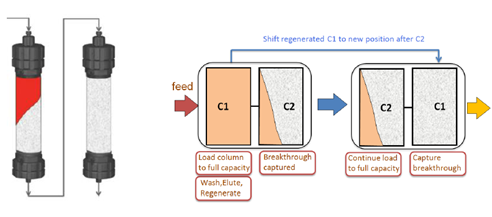 ??? ?? 傳統(tǒng)層析工藝,由于流穿效應,有30-50%的填料是無法被完全利用的,從而使得載量和處理量大為受限。Capture SMB用于優(yōu)化捕獲環(huán)節(jié),作為最簡單和最優(yōu)化的2柱位設計,可使純化效率顯著提高,并且使填料用量大為縮減。