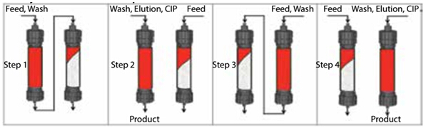 ? ? ?傳統(tǒng)層析工藝,由于流穿效應(yīng),有40-60%的填料是無法被利用的,從而使得載量和處理量大為受限。Capture SMB用于優(yōu)化捕獲環(huán)節(jié),作為最簡(jiǎn)單和最優(yōu)化的2柱位設(shè)計(jì),可使純化效率顯著提高,并且使填料用量大為縮減。