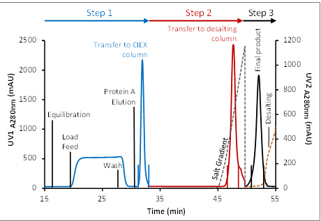 ? ? ? ?在該過程中,Protein A的洗脫組分經(jīng)過在線稀釋,直接上樣至CIEX層析柱,CIEX進(jìn)行線性洗脫,去除降解物及聚集體,將目標(biāo)組分直接上樣至脫鹽柱。三步層析緊密銜接,前一步層析的洗脫與后一步層析的上樣同時(shí)進(jìn)行,使得純化效率顯著提高。