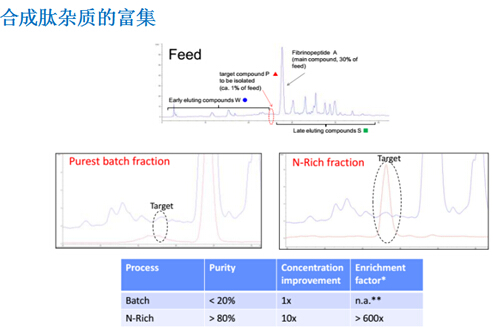 ? ??? ?N-Rich工藝是微量物質(zhì)的富集過程,比如將產(chǎn)品的相關(guān)雜質(zhì)選擇性地富集在一個(gè)循環(huán)的層析過程中,待富集至目標(biāo)量,再進(jìn)行洗脫回收。該方法特別適用于分離與產(chǎn)品有關(guān)的雜質(zhì),如異構(gòu)體和聚集體,并同時(shí)用于發(fā)現(xiàn)研究。