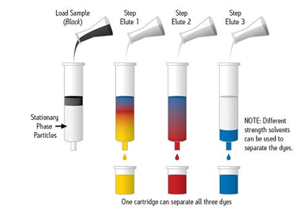 SPE通常是一種使用裝在柱芯型裝置內(nèi)的固體顆粒和色譜填充材料對樣品中的不同組分進行化學(xué)分離的樣品制備技術(shù)。樣品幾乎始終呈液態(tài),但特殊應(yīng)用項目可能使用氣相中的某些樣品進行。圖1顯示出一份樣品(圖示為黑色)正在使用SPE裝置進行處理,以使組成該樣品的每種染色組分通過色譜分析實現(xiàn)分離。
