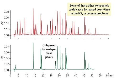 另一種考慮是存在于樣品基質(zhì)中的各種干擾物在每次進樣時可能會蓄積導(dǎo)致儀器停機。如果這些干擾物能在樣品制備期間被除去,那么目標(biāo)化合物就能使用一種更簡單、更穩(wěn)定的方法進行分析(圖3)。此圖將位于靠上位置的原始樣品與位于靠下位置的經(jīng)SPE制備后的新樣品進行了比較。