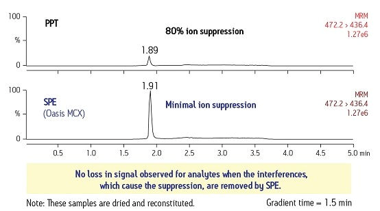 在有些情況下,源自樣品基質(zhì)的干擾物可能會增加某種化合物的信號,這叫做離子增強,可導(dǎo)致響應(yīng)值偏高。適當(dāng)?shù)腟PE方法可通過將干擾物與該化合物分離開來而最大限度減弱這種效應(yīng),從而使響應(yīng)值更準(zhǔn)確。