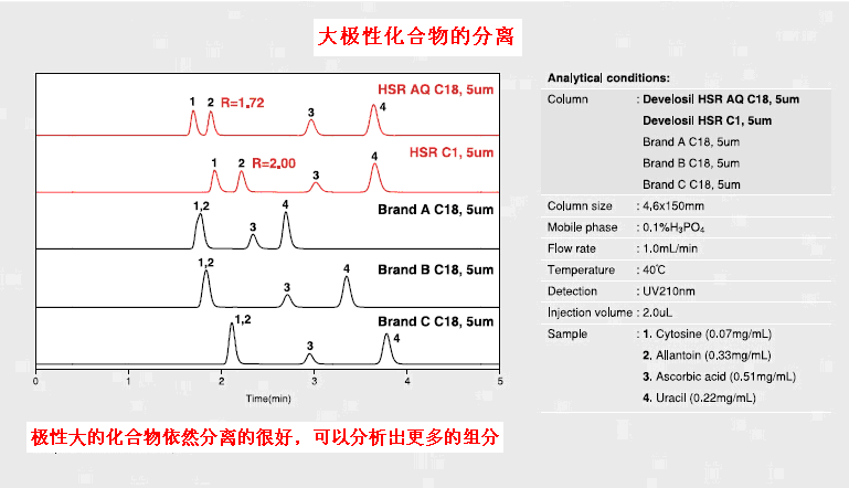 可以使保留和分離做到最大化,同時兼具耐久性和便捷性。這些特點可以廣泛的適用于科研研發(fā)和質(zhì)量控制。一般情況下,大極性的化合物使用HILIC模式的柱子,但是,我們可能更傾向于在分析的時候用類似的反相柱。因此,Develosil HSR AQ C18和C1柱,應(yīng)運(yùn)而生!