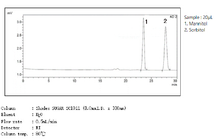 美國藥典USP規(guī)定,分析甘露醇使用符合L19填料要求的色譜柱,柱子尺寸7.8*300mm,甘露醇與山梨醇的分離度達(dá)到2以上。使用Shodex SUGAR SC1011-7F能完全符合美國藥典要求。